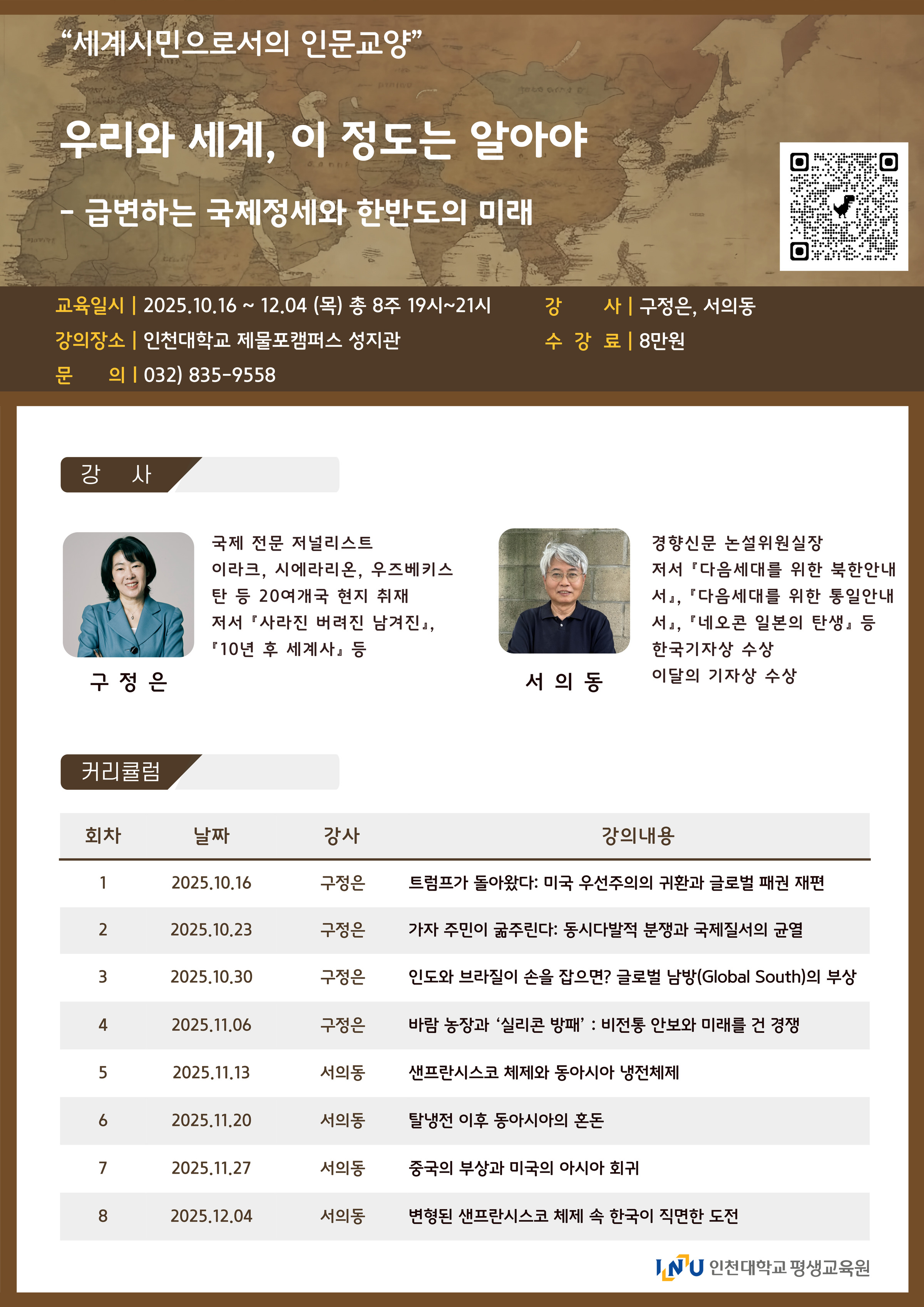 이런 위기 상황에서 미국 우선주의를 내세운 트럼프 대통령이 재선되었고, 우크라이나-러시아 전쟁, 이란-이스라엘 전쟁, 팔레스타인 가자지구 문제 등 세계 곳곳에서 전쟁과 분쟁이란 갈등 상황에서 다양한 파열음이 쏟아져나오고 있다. 제2차 세계대전 이후 80년 동안 구축되었던 국제 질서가 심각한 위기를 맞이하고 있는 이때, 급변하는 국제정세와 한반도의 미래를 심도 있게 분석·전망하는 강좌를 기획한다.